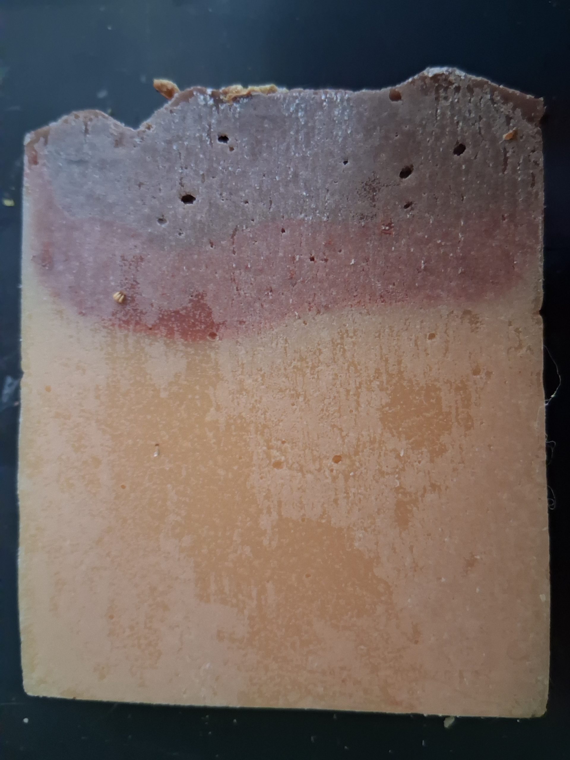 Ingredients: olive oil*, cocoa butter, coconut oil*, castor oil, water, lye, goat milk, essential oils, red clay, rose clay, annatto seeds, orange peel.